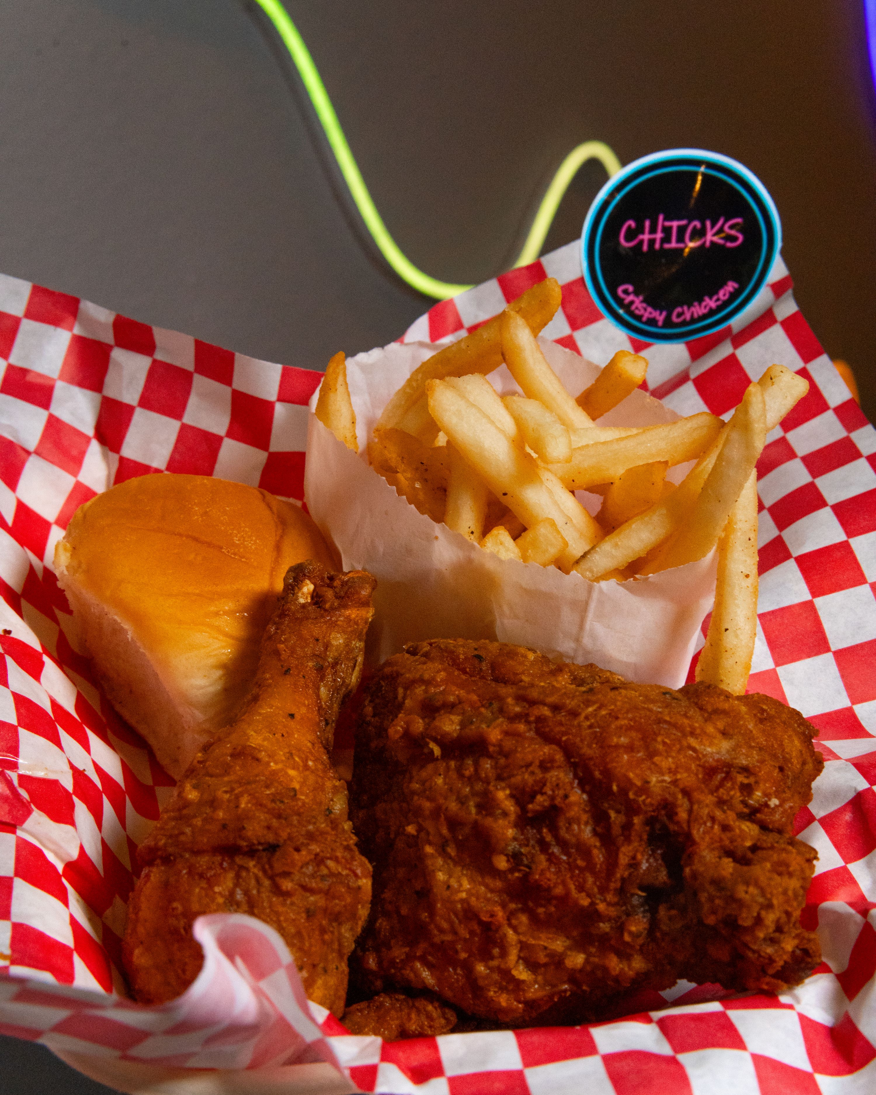 Breast, thigh, and wing or leg. Roll, Drink, and choice of small side, (fries, tots, coleslaw, pasta salad, chickpea salad)